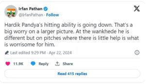 అయితే ఆందోళనకరంగా, ఒకప్పుడు ప్రత్యర్థి బౌలర్లను భయపెట్టిన హార్దిక్ అదే హిట్టర్‌గా కనిపించడం లేదు. అప్పుడప్పుడు హిట్ కాకుండా, హార్దిక్ బాల్‌ను పెద్దగా కొట్టే శక్తిని మరియు ఎత్తును అందించిన బంతిని వెనుకకు మరియు లైన్‌లో పొందడానికి చాలా తరచుగా కష్టపడ్డాడు. సరళంగా చెప్పాలంటే, బౌలర్లకు సహాయం అందించే డెలివరీ వచ్చినప్పుడల్లా, హార్దిక్ బ్యాటింగ్ కొద్దిగా నిరాశకు గురిచేస్తుందని పఠాన్ సూచించాడు.